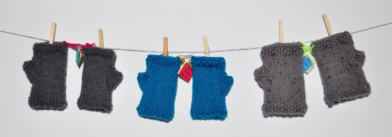 These gloves are made with 100% soft acrylic yarn. They can be machine washed and tumble dried. These gloves are great if you want to be able to tuck your hands away from the cold wind but still have quick access to send a text, get a grip on your dogs leash or do some knitting at a bus stop!